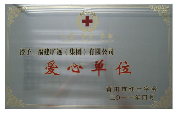 2011年04月 福建曠遠(集團)有限公司,應邀參加在莆田市政府召開的莆田市紅十字會第五屆理事會第五次會議,會上集團被莆田市紅十字會授予“人道 博愛 奉獻”“愛心單位”的榮譽稱號。