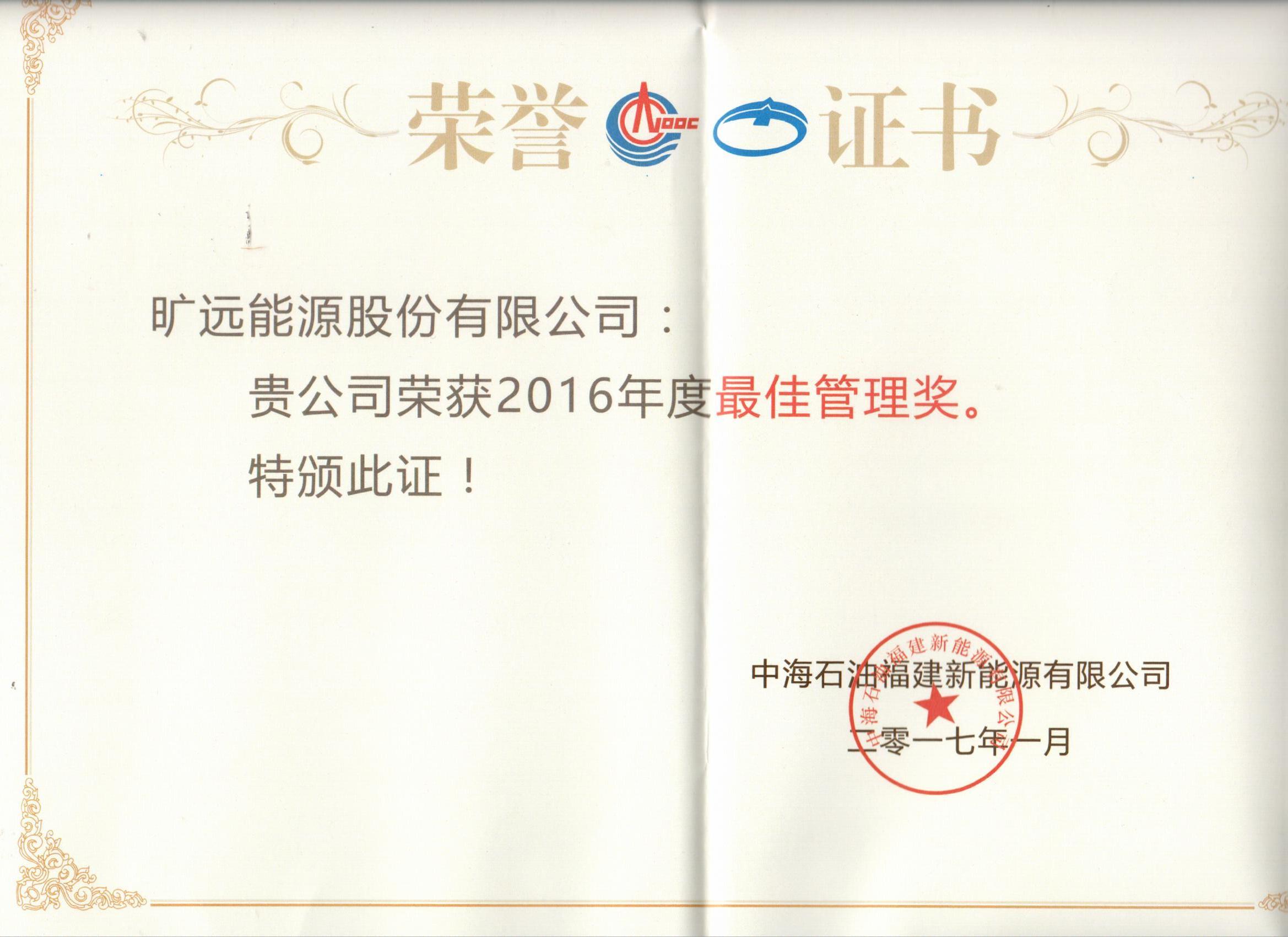 2017年1月 獲得中海石油福建新能源有限公司授予的“2016年度最佳管理獎”