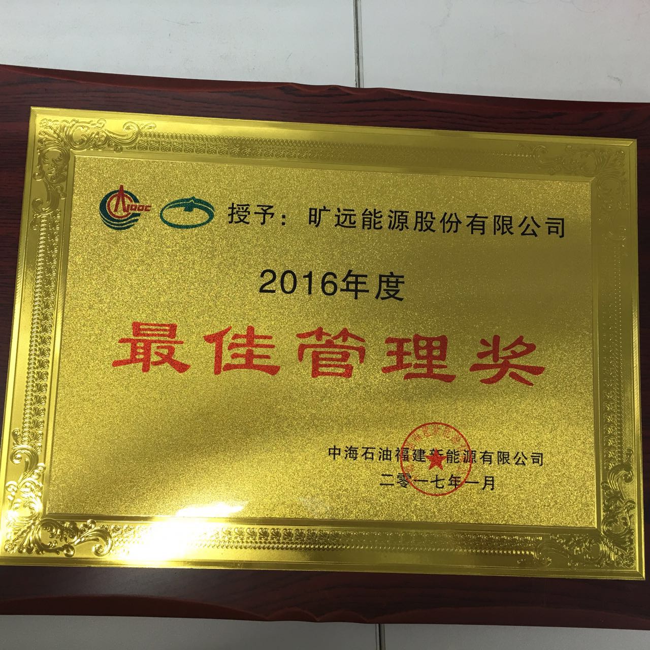 2017年1月 獲得中海石油福建新能源有限公司授予的“2016年度最佳管理獎”