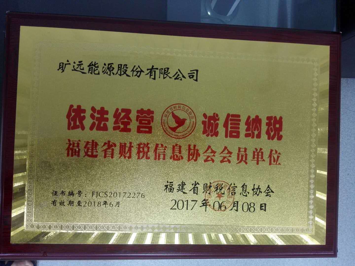 2017年6月 獲得福建省財稅信息協(xié)會頒發(fā)的“依法經(jīng)營 誠信納稅”。