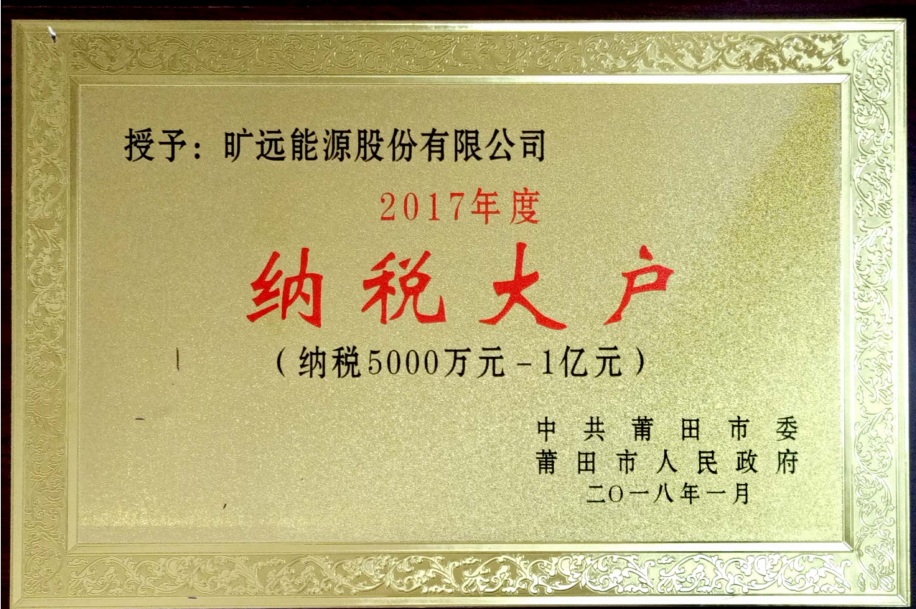 2018年01月 曠遠(yuǎn)能源股份有限公司被中共莆田市委、莆田市人民政府授予“2017年度納稅大戶”榮譽稱號。