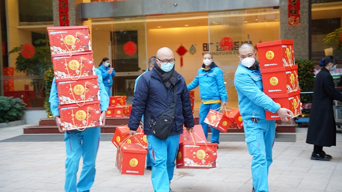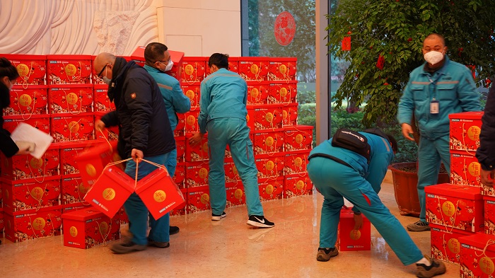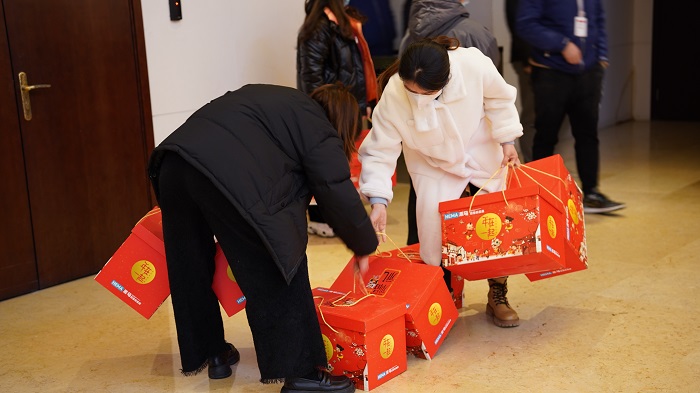 在所有年貨到位之后,各公司員工來到一樓大廳,滿懷激動的心情領(lǐng)取年貨。“快快快,點一下。”“你幫忙多拿幾個,一起上去!”“這個不錯,我喜歡吃。”年貨發(fā)放現(xiàn)場氣氛熱烈,大家提著沉甸甸的年貨,臉上洋溢著笑容,新春佳節(jié)的喜悅已縈繞在公司內(nèi)外。