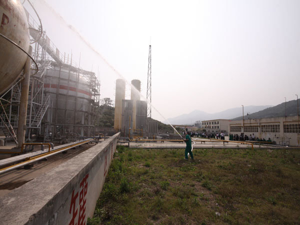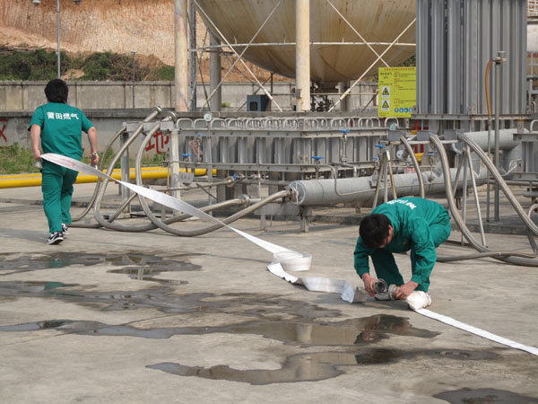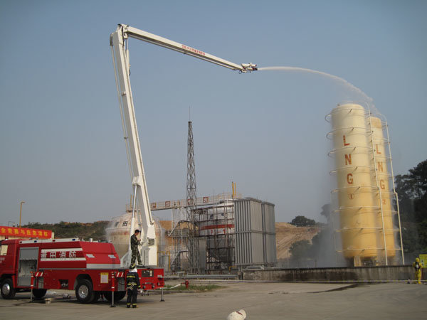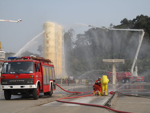 15:30分,隨著生產(chǎn)部報(bào)警聲響起,LNG灌區(qū)發(fā)生泄漏,現(xiàn)場(chǎng)指揮接警后立即按響報(bào)警器,指揮相關(guān)小組啟動(dòng)消防水泵,對(duì)灌區(qū)進(jìn)行緊急噴淋,隔離相鄰儲(chǔ)罐,并組織員工按預(yù)定區(qū)域到達(dá)避難位置。市消防派出2輛高噴消防車、6輛水罐消防車到達(dá)起火現(xiàn)場(chǎng),火情偵檢組隨即展開(kāi)偵檢,先用泄露儀對(duì)現(xiàn)場(chǎng)進(jìn)行濃度檢測(cè),并用隔離帶劃出相應(yīng)的警戒線,保安配合警戒組疏散區(qū)域內(nèi)無(wú)關(guān)人員及在場(chǎng)使用中的車輛熄火,同時(shí)關(guān)閉大門(mén),禁止除消防車、搶險(xiǎn)車外的一切車輛出入。在得知了著火位置和泄漏程度后,中隊(duì)指揮員立即下令,展開(kāi)滅火行動(dòng)。消防隊(duì)員穿上消防戰(zhàn)斗服、佩戴防毒面具和呼吸器、攜帶銅質(zhì)工具和滅火器材迅速趕往事故儲(chǔ)罐,關(guān)閉儲(chǔ)罐根部所有閥門(mén)。而其余消防車按照預(yù)期指定位置,全方位對(duì)LNG灌體進(jìn)行火災(zāi)撲救。