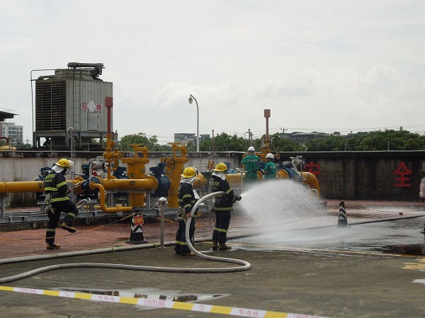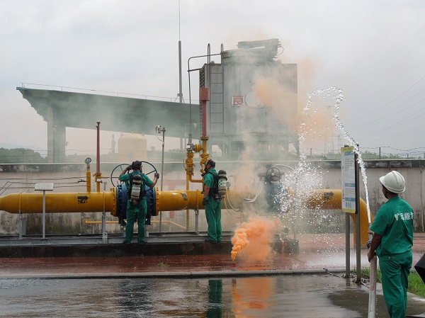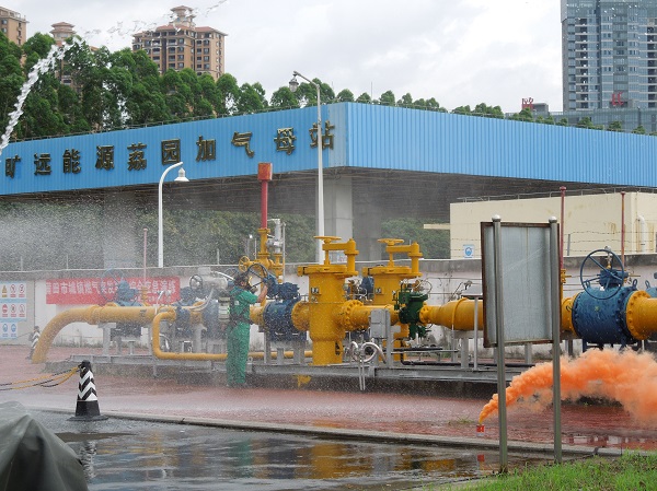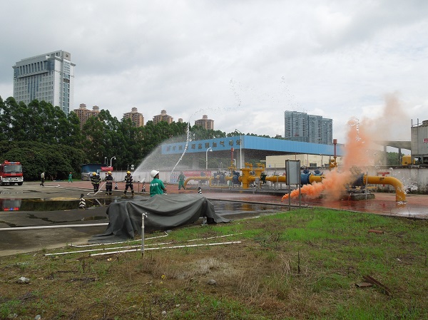 當天上午9時許,由演練總指揮副總裁黃劍鋒正式下達演練指令,演習的內容為荔園站遭到恐怖襲擊,調壓站設備壓力表遭到破壞,出現泄漏,被荔園站保安和員工發(fā)現并及時控制,封鎖現場啟動應急機制。隨后,場站人員及消防部門通過向泄漏處噴灑消防水降低現場天然氣濃度,搶險組到場后對受損管線進行切換,保證天然氣正常供給,并更換受損儀表,上午10時順利搶修完畢并恢復使用。